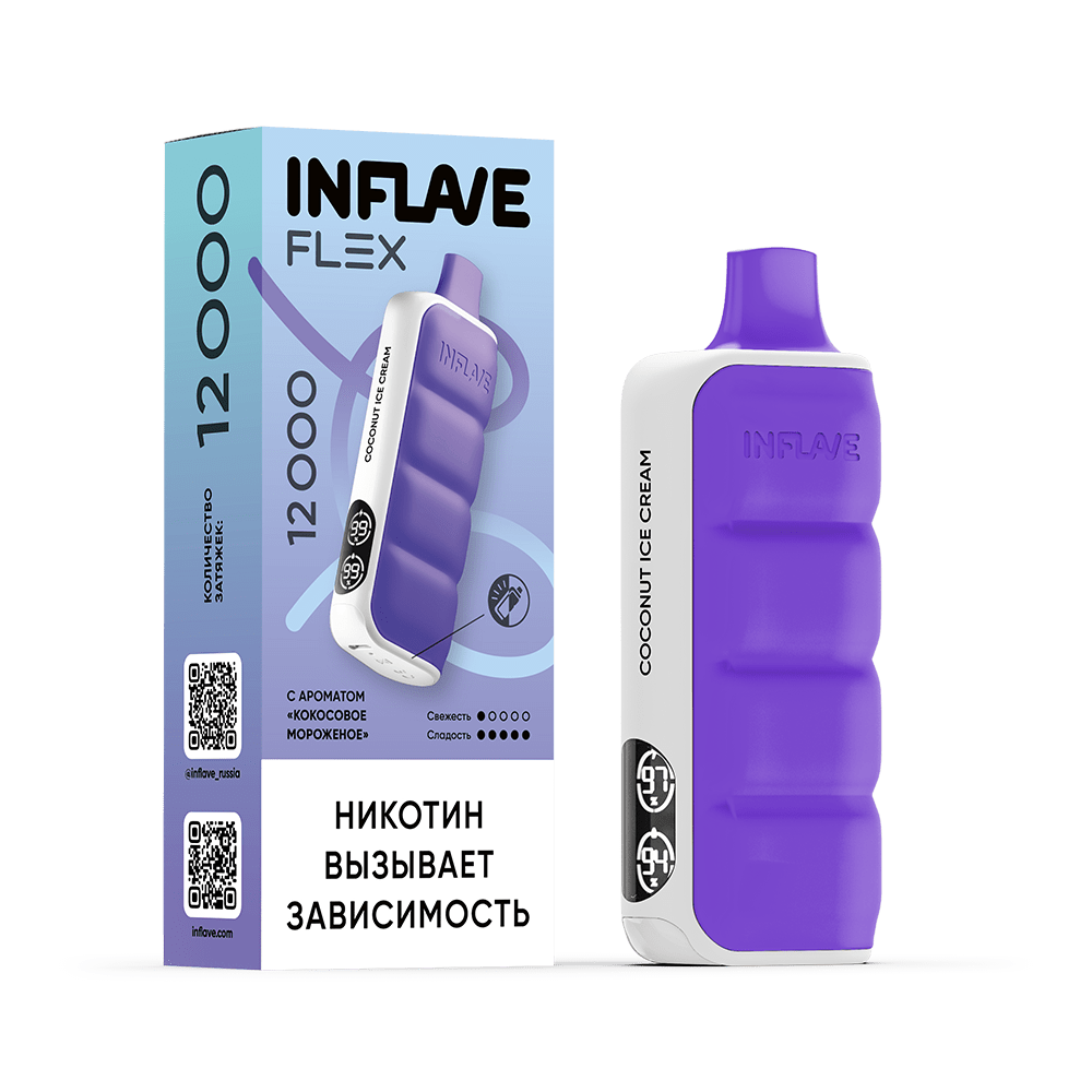 | Количество затяжек, шт12000 | Крепость, %2 | ЛинейкаINFLAVE FLEX 12000 |